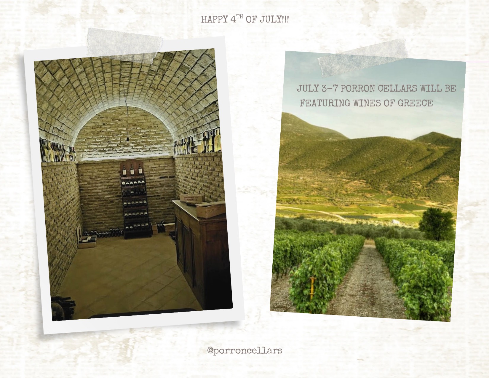 Travel to Greece at Porrón Cellars, July 3-7 to experience the ancient vineyards of Greece. There will be a selection of wines available during this time. Porrón is open Sunday & Monday as well as Friday & Saturday, 3:00 pm-9:00 pm.
