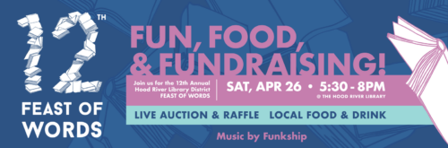Come celebrate the Hood River Library Foundation’s annual Feast of Words Gala and Fundraiser on Saturday April 26 from 5:30pm-8pm. With libraries located in Hood River, Cascade Locks, and Parkdale, and a bookmobile, the Hood River County Library District offers a wide range of services to everyone in the community. Books, movies, games and puzzles, a Library of Things, classes, kid’s activities, meeting spaces, computer and internet access, and much, much more.