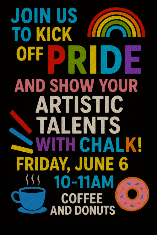 Join Sustain Home as they kick off Pride month with coffee and donuts on Friday, June 6. Head on over between 10-11 am to enjoy coffee, donuts, and show your artistic talent with chalk art.