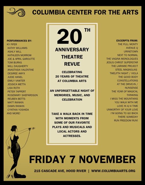 Join Columbia Center for the Arts as we celebrate 20 years of theater in Hood River with a special one-night-only 20th Anniversary Revue Show. Take a walk back in time through two decades of unforgettable performances, featuring local actors and favorite moments from beloved plays and musicals that have graced our stage in The Vagina Monologues and Jesus Christ Superstar to Avenue Q, The Laramie Project, Urinetown, The Full Monty, Next to Normal, Twelfth Night, and more.