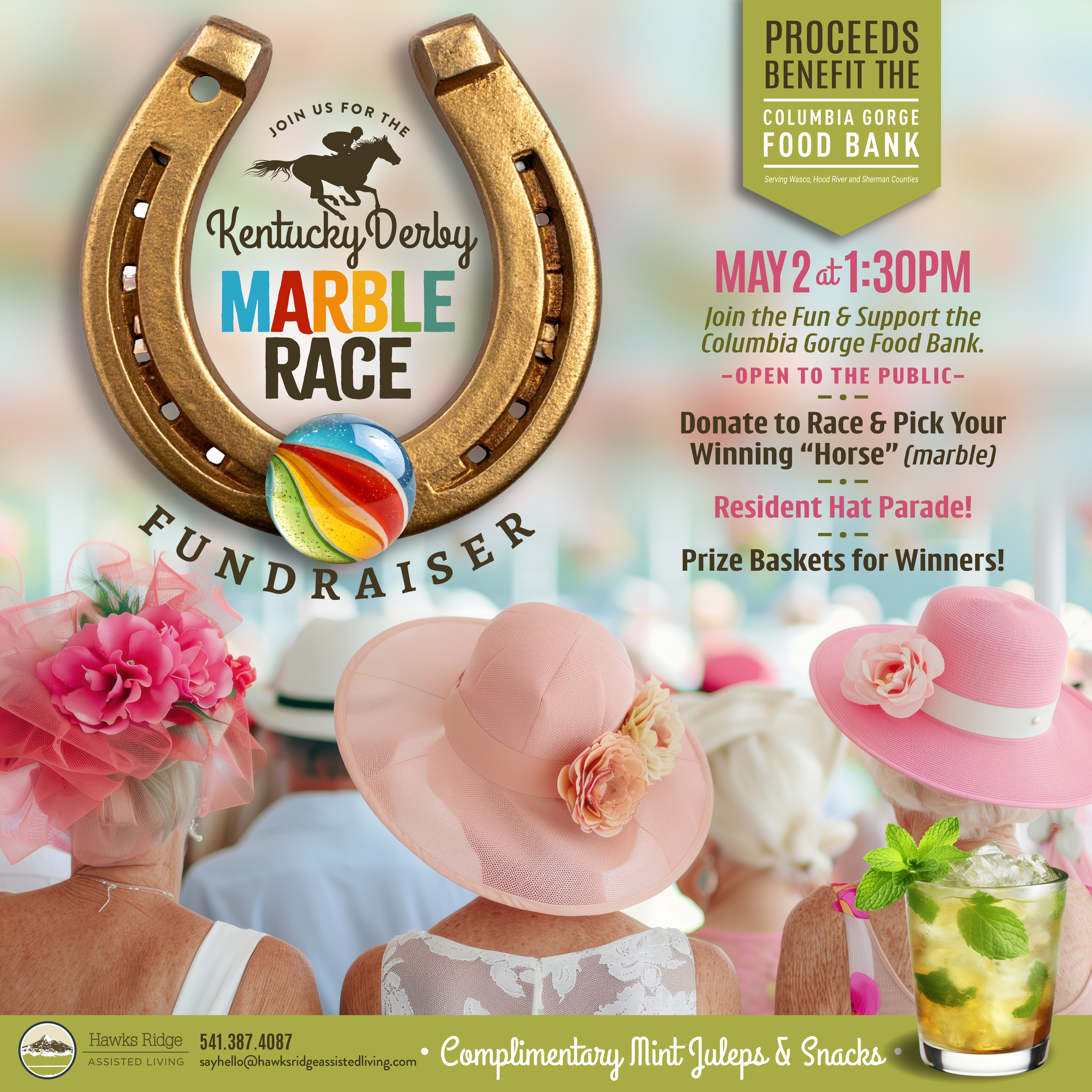 We are excited to announce that we will be holding a fundraiser for the Columbia Gorge Food Bank. We are supporting our local Hood River Community. Our first ever Kentucky Derby Marble Race. Be prepared to donate and place your bet on your favorite horse/marble to win place or show. Our flyer is below for more details. Please join us for a day of food, fun, and fundraising.
