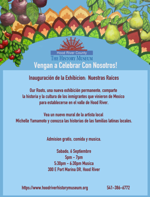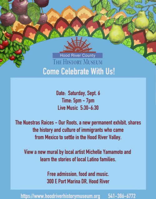 The History Museum of Hood River County, in collaboration with consultant Juan Reyes and artist Michelle Yamamoto, is pleased to share the newest addition to the museum’s permanent collection, Nuestras Raíces (Our Roots) Latino history exhibit.