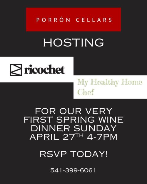 Spring Wine Dinner featuring Ricochet Wines paired with Chef Teigha Mondragon Sunday, April 27th 4-7PM