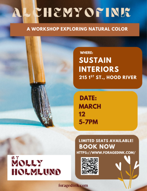 Explore the beauty of natural inks in this hands-on workshop (with Molly Holmlund). We will learn the basic techniques and process of making ink from natural and familiar materials. Make Oak Gall ink in class and paint with already made inks. Experiment freely with their unique color and qualities. Play and get lost in the alchemy of inks. Leave with your own finished art.