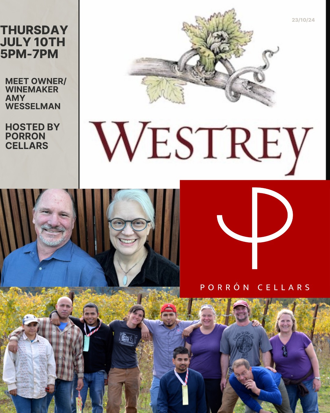 Join Westrey Wine at Porrón Cellars on July 10th, 5-7 pm. Meet the owner/winemaker Amy Wesselman. Westrey was founded in 1993 and brings their experience and great wine to Hood River.