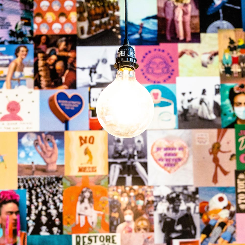 The collage wall, when you walk in the door, sets the tone: a mosaic of quotes, quirky art, unexpected layers, and joyful aspirations. Thought starters. Mood shifters. One-liners that make you laugh or pause, and comment to your neighbor in line.